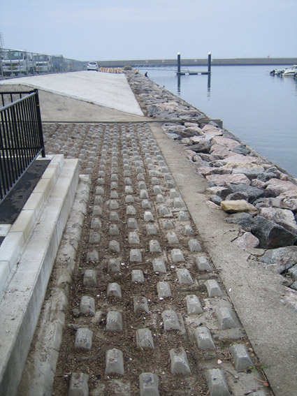 丁度この地区の満潮時刻がAM8時過ぎでしたのでもう少し台風のスピードが遅く満潮時の通過でしたらかなり危険水位ではなかったかと思う。画像はボールについた桟橋固定用のローラーの傷がその水位の高さを物語る。また、通過後吹き返し(北西風)画像右奥側からの強風により桟橋右側に係留しているボートの船尾側ロープが破断し桟橋等に船首側を摩擦等により破損、また同Yブーム内に係留している船に傷を与えた事例が5例程あったようだ。TOP PAGE △